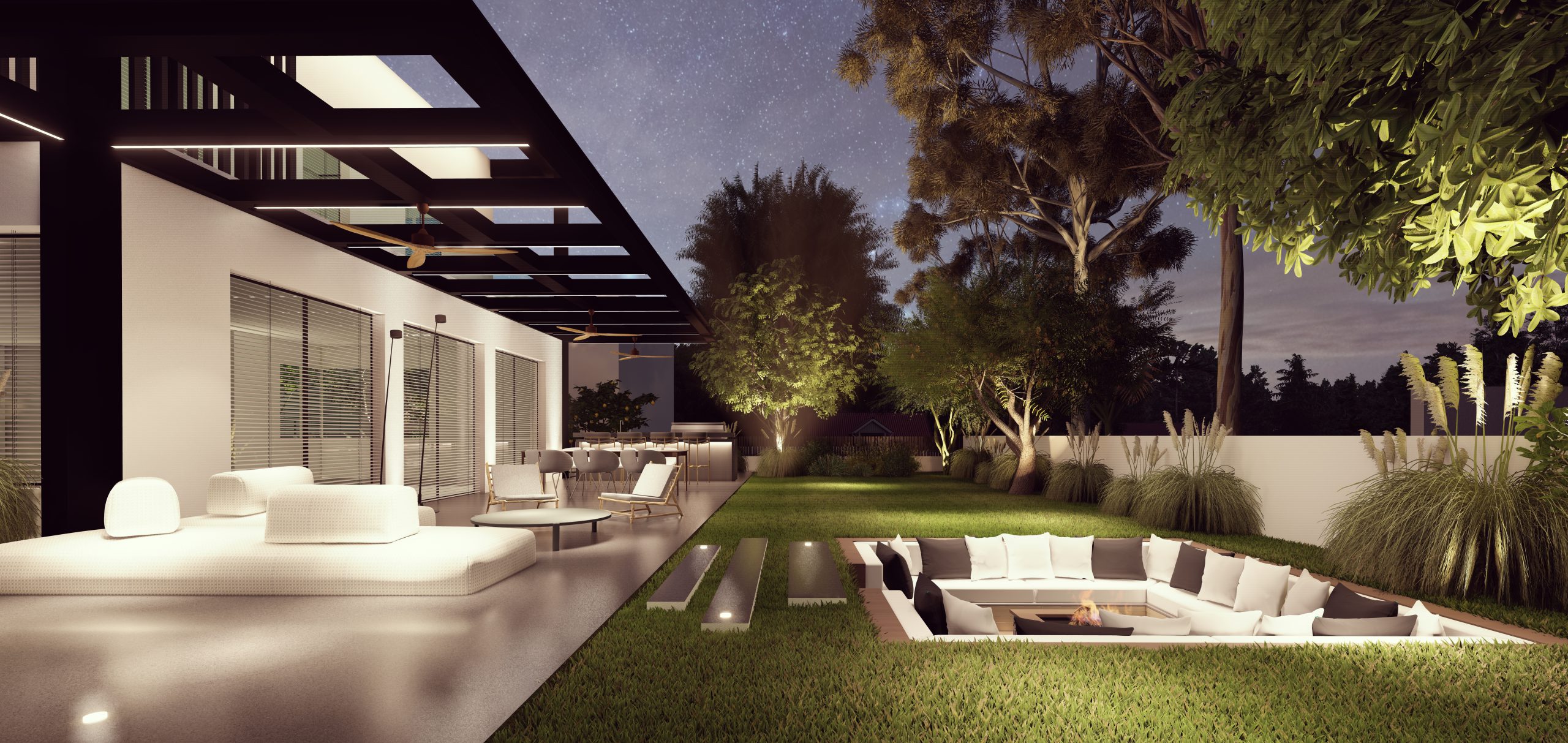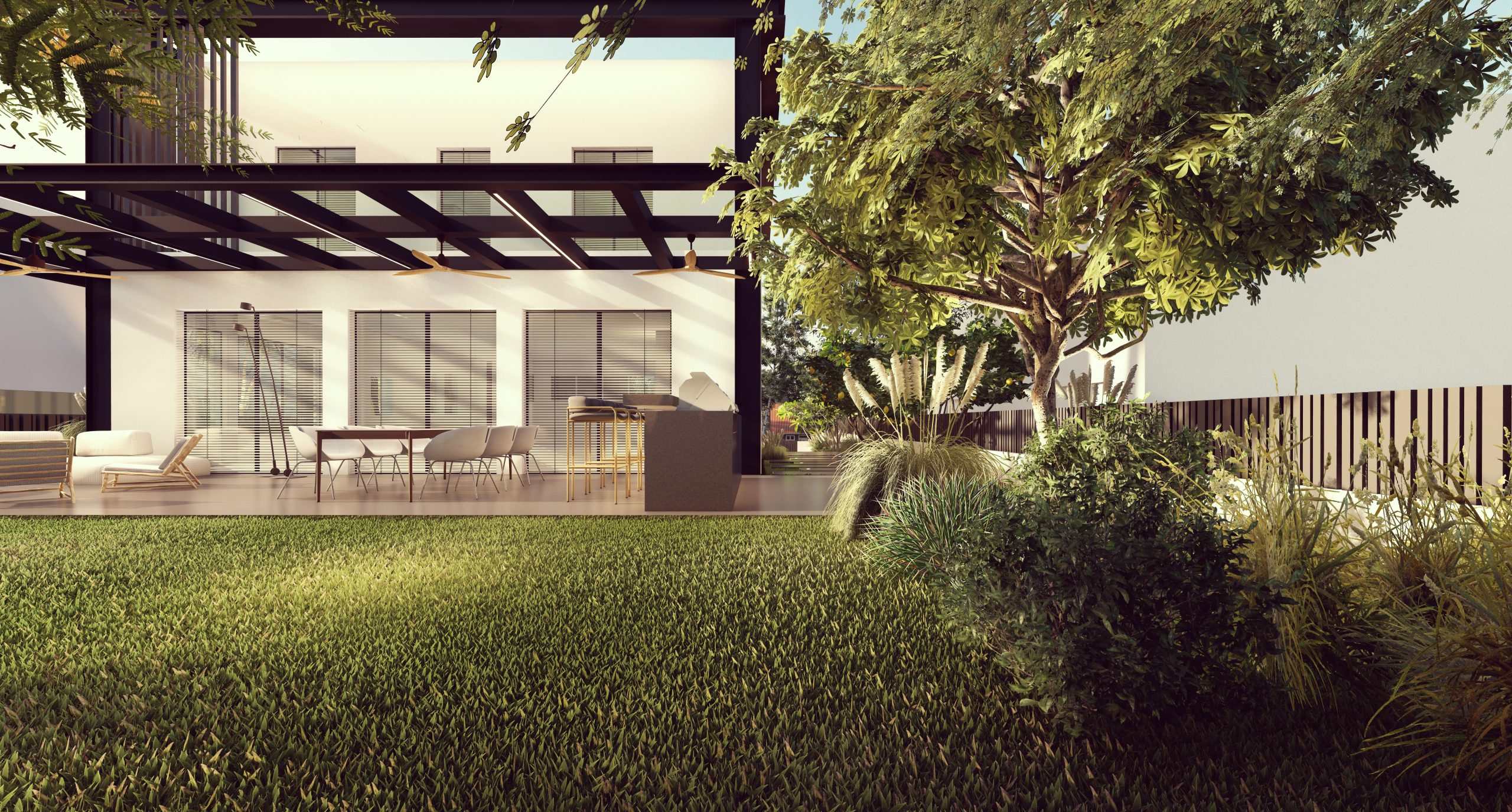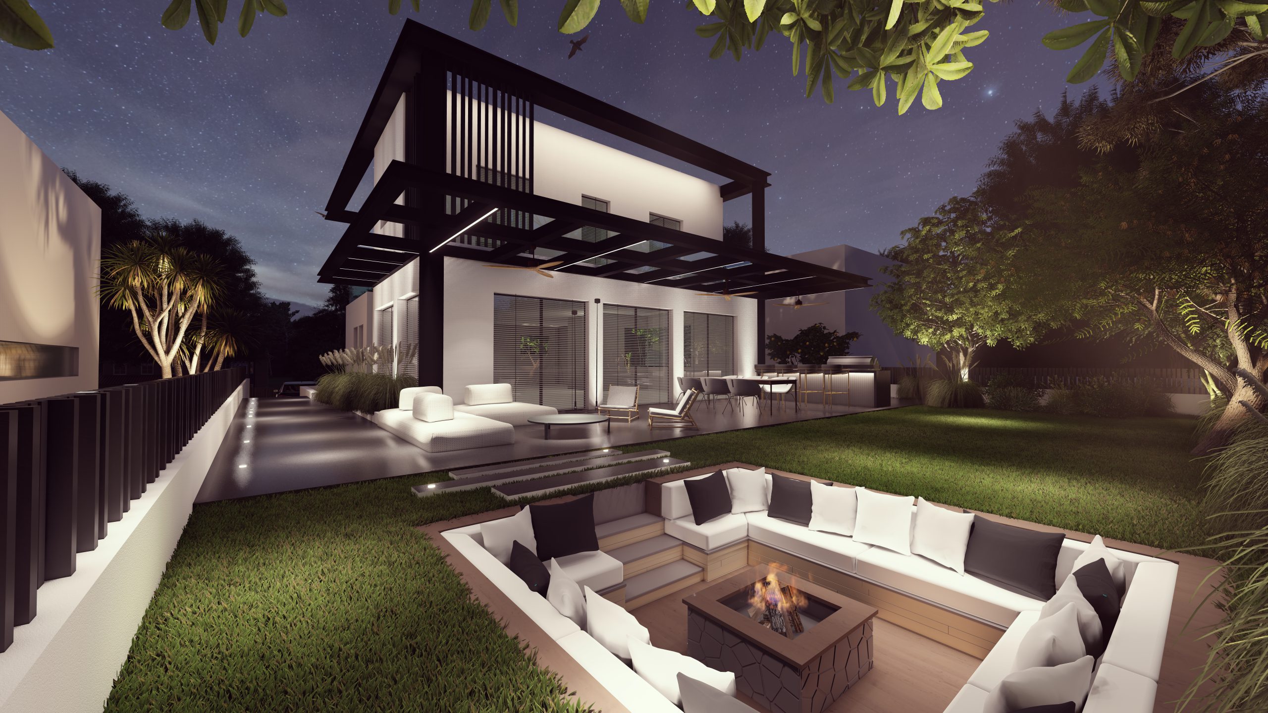 Single house A house with a built area of 275 square meters was designed for a couple with four children. The customers' desire was a spacious, functional, modern house with plenty of storage space that allows accommodation for a large number of people. The family loves to entertain mostly in the garden so we created a cozy outdoor kitchen and a cozy sitting area for the cool days.